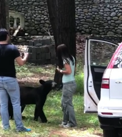 En otro de los clips se puede ver al oso en dos patas, asustando a una pequeña que se encuentra a bordo de una camioneta, quien no pudo evitar gritar ante la cercanía del animal.